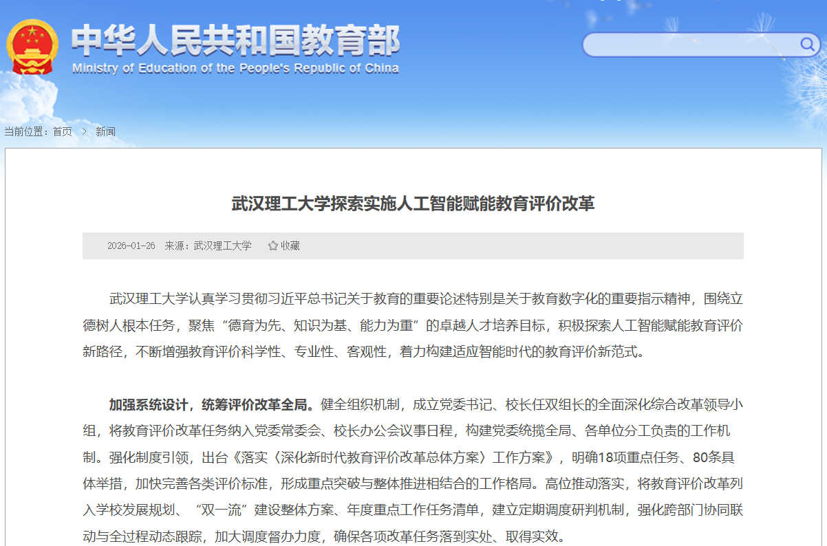 1月26日,教育部网站以《武汉理工大学探索实施人工智能赋能教育评价改革》为题刊发学校积极探索人工智能赋能教育评价新路径,不断增强教育评价科学性、专业性、客观性,着力构建适应智能时代的教育评价新范式。全文如下。