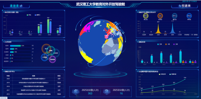 为提升决策的科学性与前瞻性,国际处对“教育对外开放驾驶舱”进行战略性升级与视觉重塑。新版驾驶舱优化界面布局与展示效果,强化数据深度关联分析与成效可视化。系统围绕“引进来”与“走出去”两大战略维度进行设计:在“引进来”方面,动态对比展示各学院在外籍专家引进效益、留学生培养规模及举办国际会议数量的关联成效;在“走出去”方面,清晰呈现师生国际流动、国际科研合作项目、学者国际学术任职等关键指标。通过将海量数据转化为直观、可比的动态图表,驾驶舱为校院两级管理者提供“一屏统览”的国际化发展全景图与实时监测仪表盘,有力推动外事工作从经验管理向精准数据驱动决策的深刻转变。