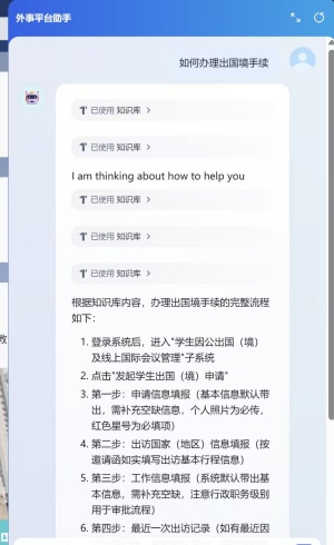 为响应师生日益增长的即时化、个性化咨询服务需求,部门引入人工智能技术,建成外事领域专属“智能客服”系统。该功能深度集成学校大模型能力,通过系统学习外事规章制度、高频问答知识库及业务流程手册,构建起专业、精准的智能问答体系。师生可随时随地通过自然语言交互,快速获取关于出国(境)流程、签证政策、项目申报等问题的标准化解答。标志着外事服务模式向智能化、自助化迈出了关键一步。